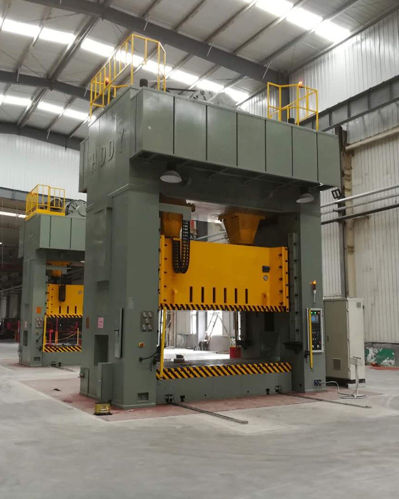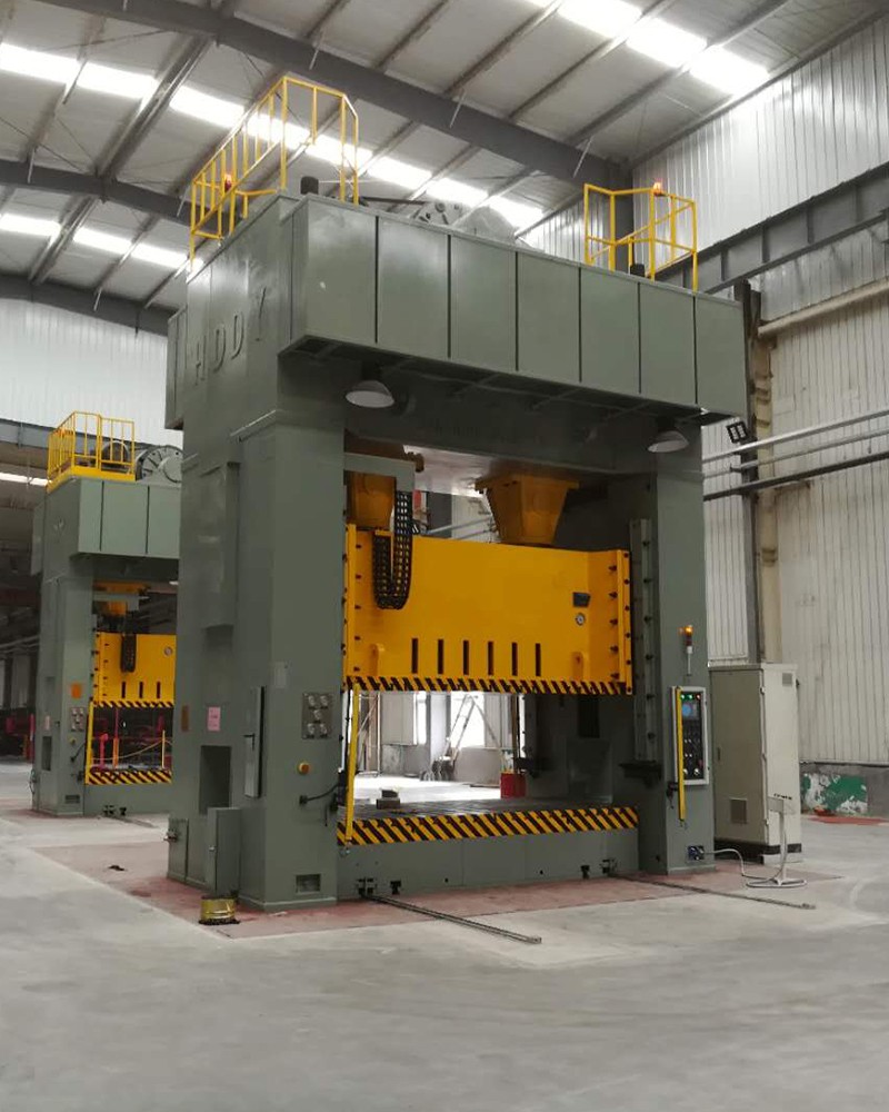 全鋼板焊接分體式機(jī)身,由底座、立柱、橫梁三大件通過4根拉緊螺栓預(yù)緊成一體,橫梁與滑塊之間采用導(dǎo)柱導(dǎo)套方式過渡連接